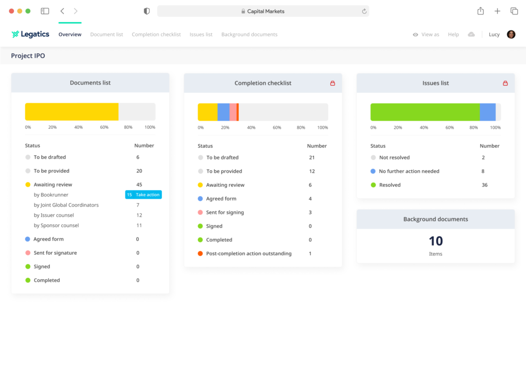 You don’t have to switch between documents, spreadsheets, email, and other tools to keep your transaction running smoothly.Legatics gives you the tools needed to collaboratively plan, organise, and execute your transaction in one place – no matter what type of transaction you are working on.